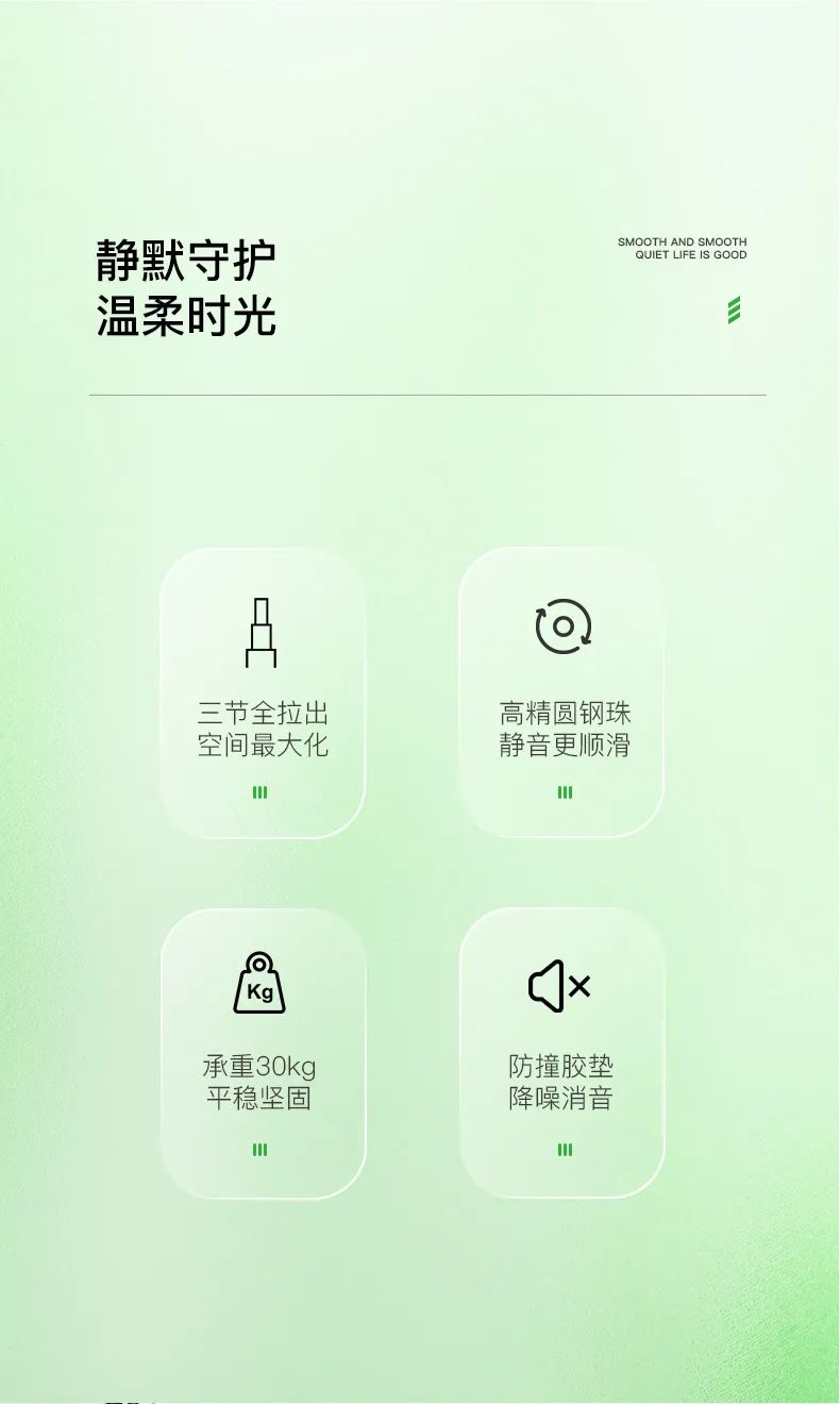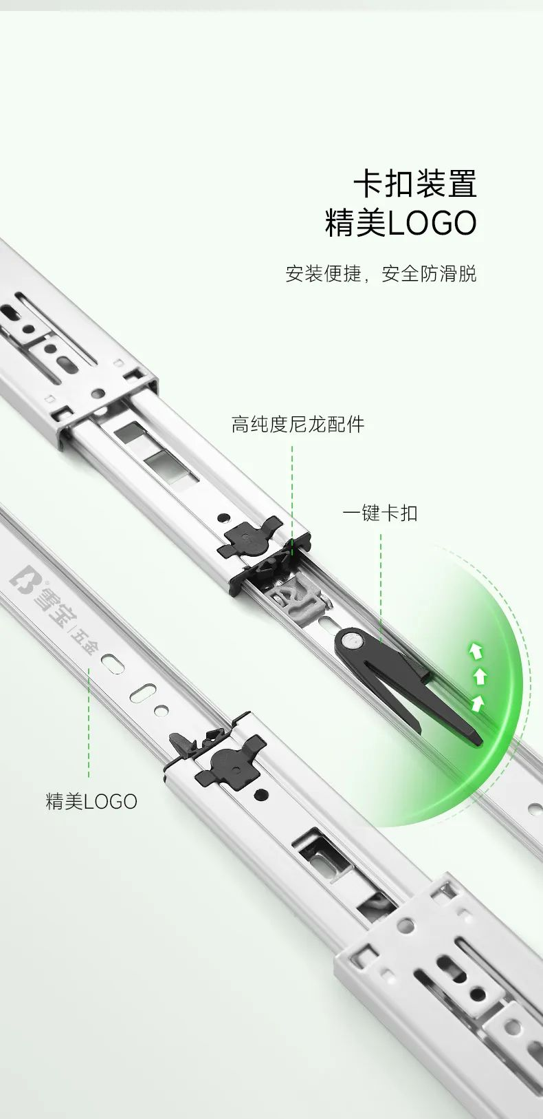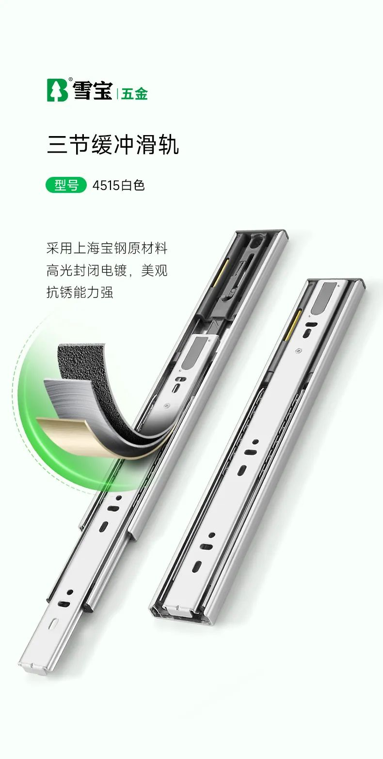 滑軌抽屜在現代家具中是必不可少的組成部分,而在整個抽屜的設計中,小小的滑軌對整個抽屜的質量可有著舉足輕重的影響,那些大大小小的抽屜能否自由順滑地推拉、承重如何,全靠滑軌的支撐。雪寶4515緩沖(反彈)三節軌→靜默守護居家生活的溫柔時光!