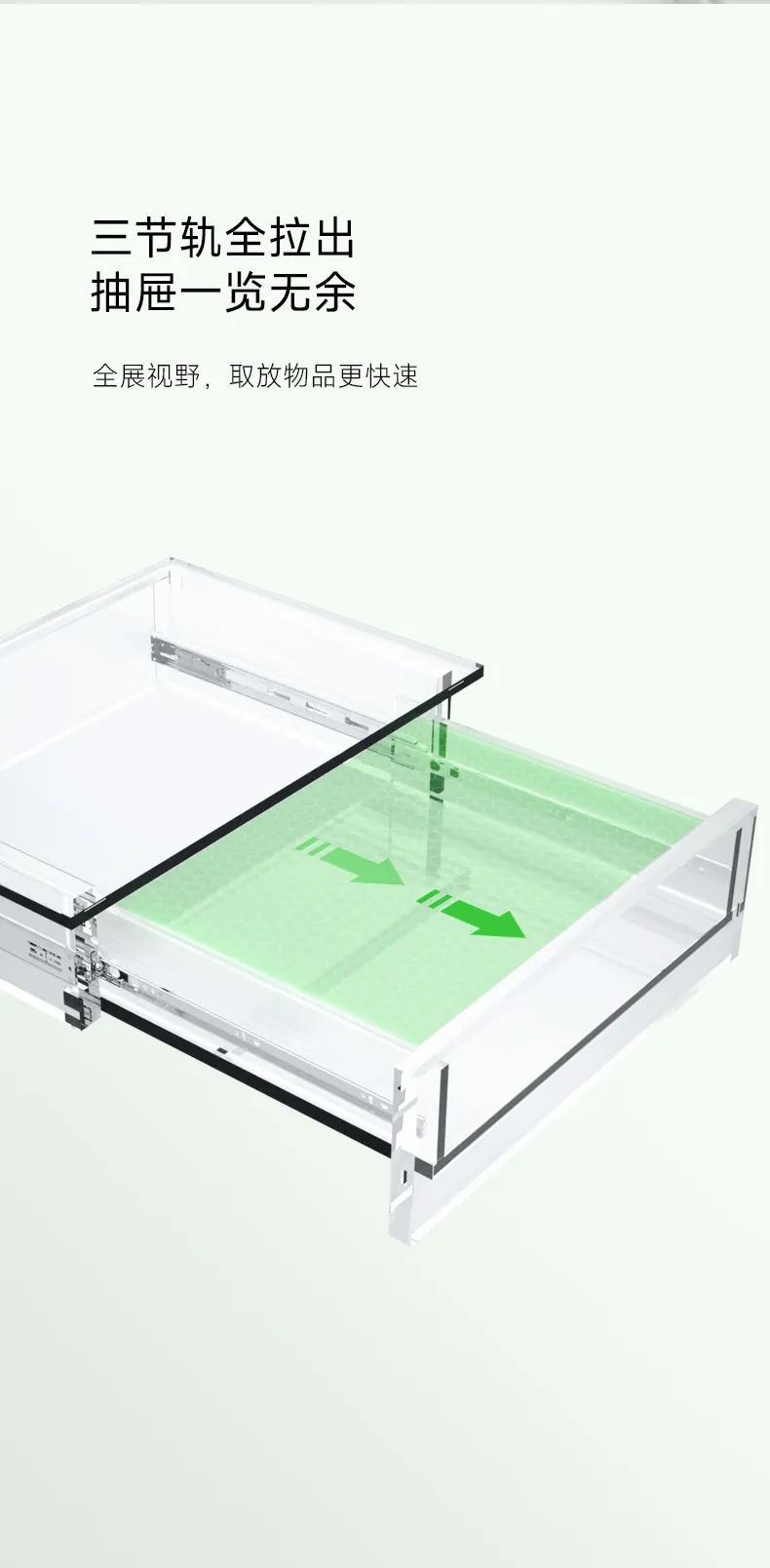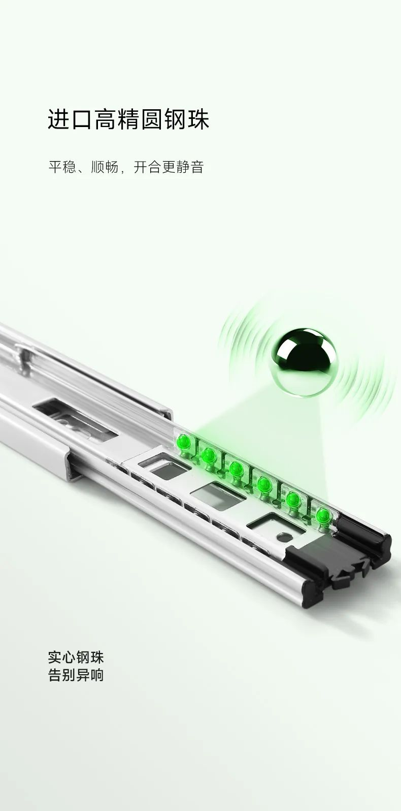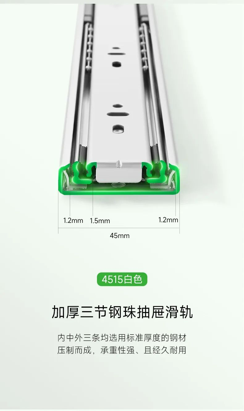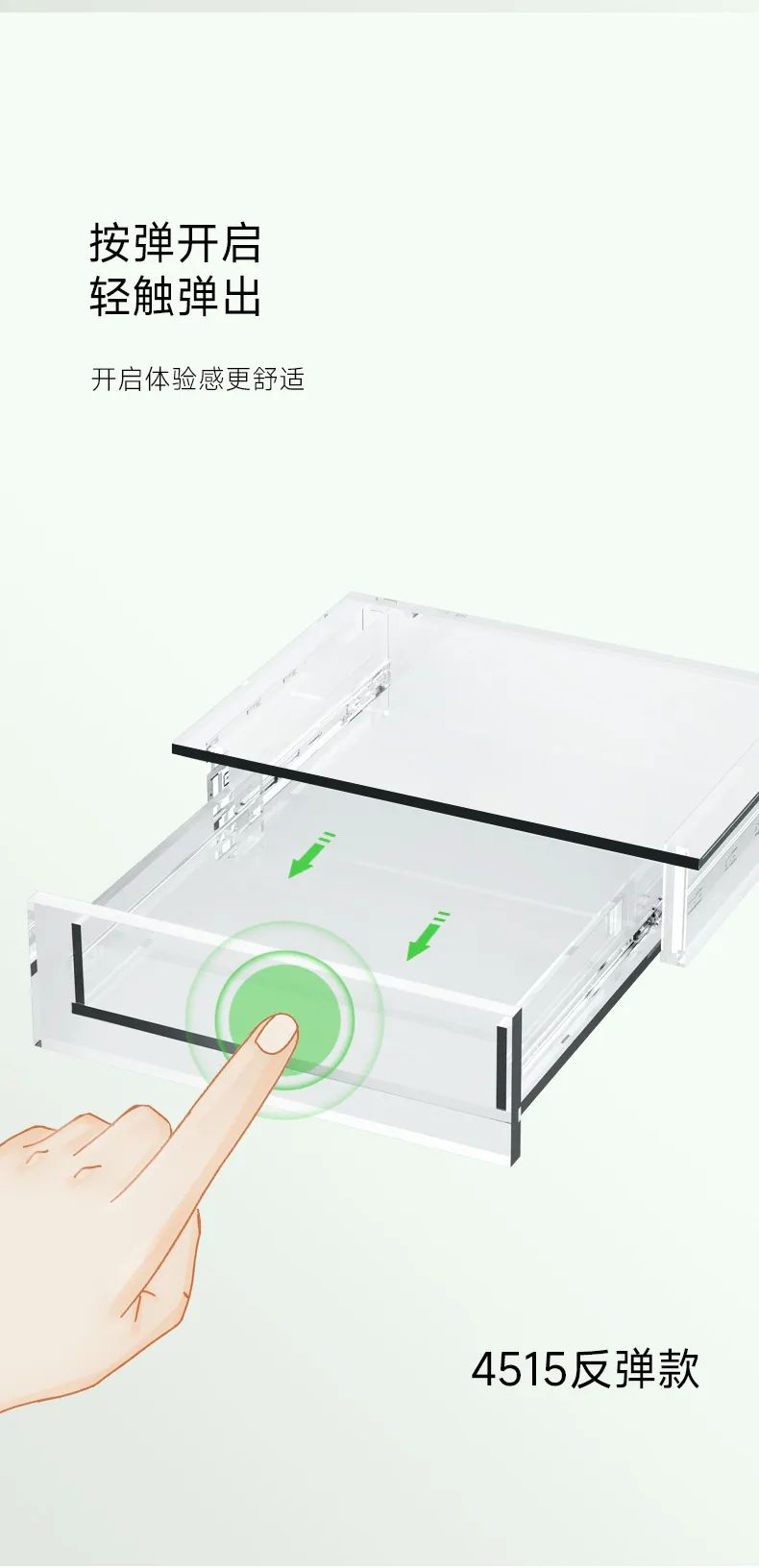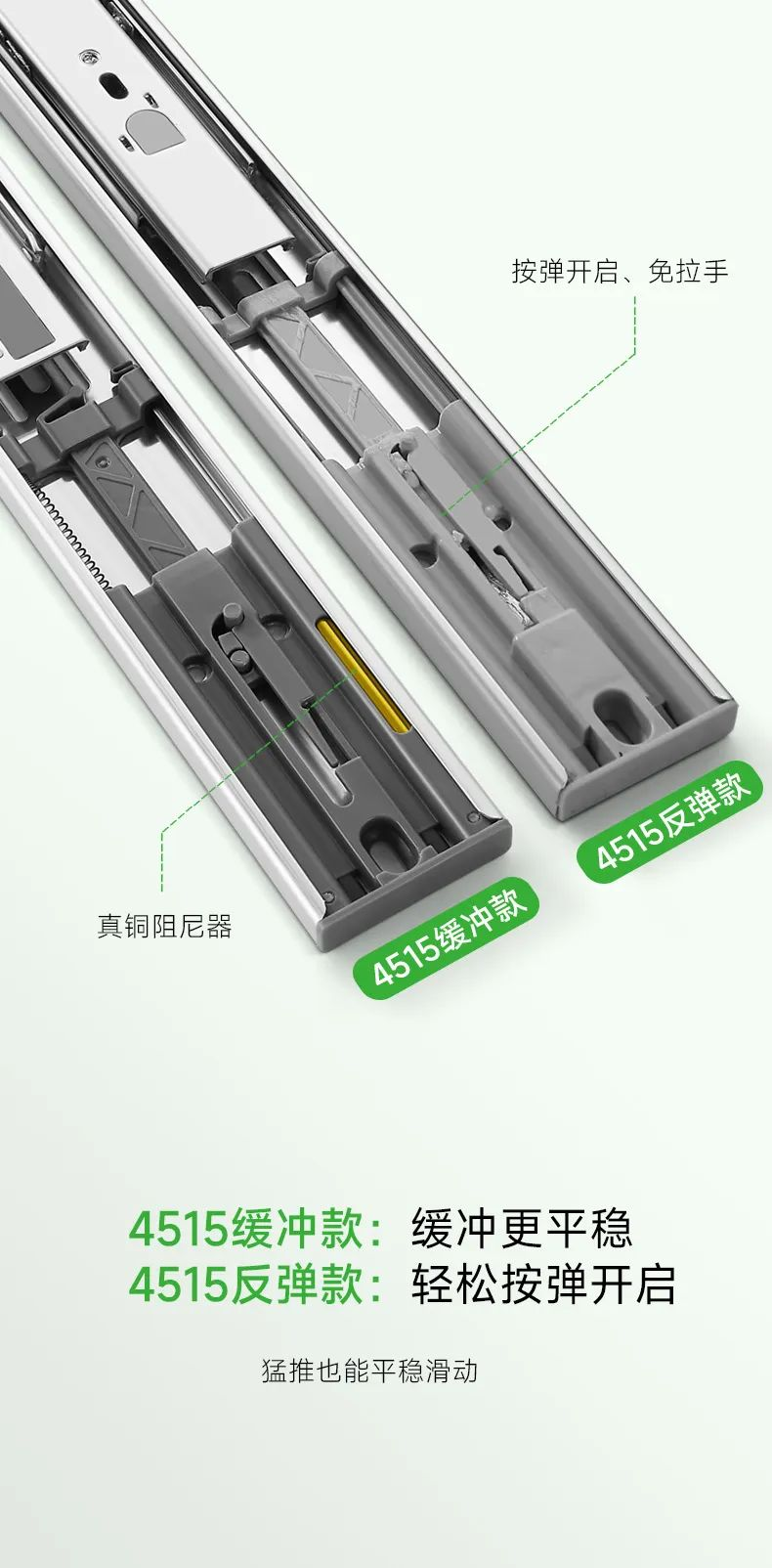 4515緩沖款:緩沖更平穩4515反彈款:輕松按彈開啟無論是緩沖款還是反彈款,都具備下述優勢:1、上海寶鋼原材料,高光封閉電鍍,抗銹能力極強;2、加厚三節鋼珠抽屜滑軌,標準厚度,經久耐用;3、進口高精圓鋼珠,平穩、順暢,開合更靜音;4、三節軌全拉出,抽屜一覽無余,空間最大化;5、承重30kg,平穩堅固;6、防撞膠墊,降噪消音;