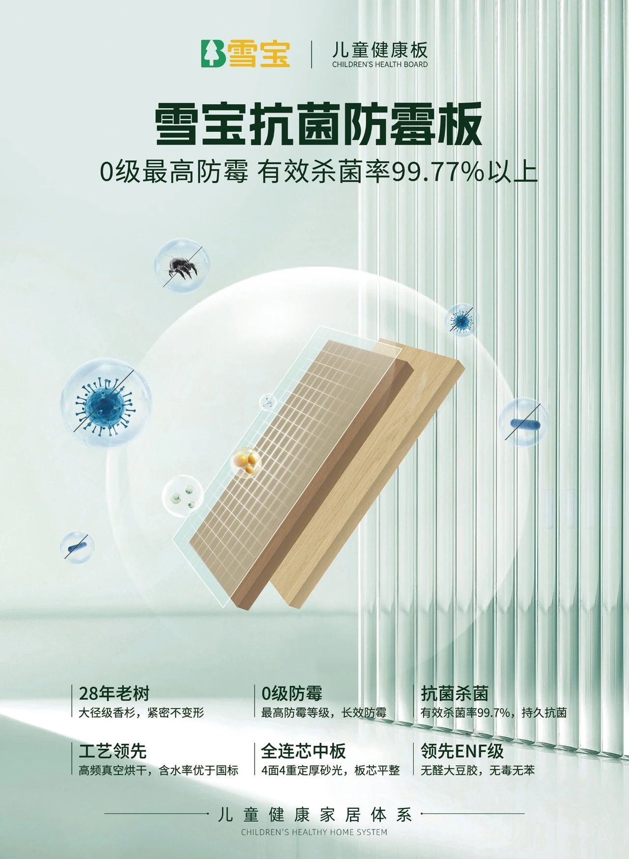 這個時候,有著抗菌、防霉雙重功能的雪寶抗菌防霉板方能大顯本領了,其優異的抗菌防霉表現讓板材到空間的環保躍級,實現24小時持續守護,能夠貼心呵護家人的健康生活。