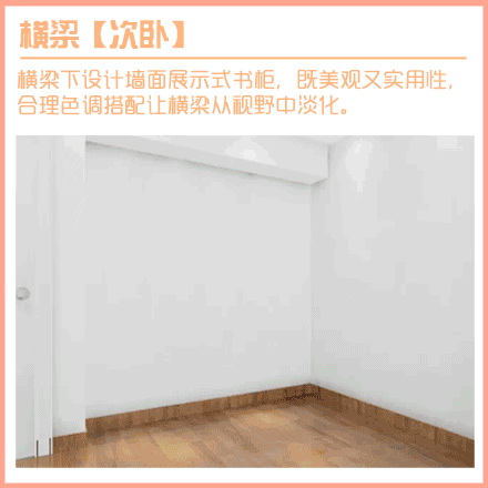 【7、柱子·次臥】橫梁下設計墻面展示式書柜,既美觀又實用性,合理色調搭配讓橫梁從視野中淡化。