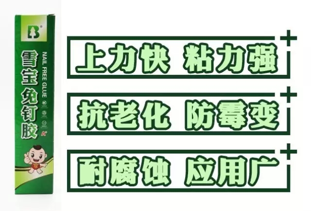 雪寶免釘膠是高端技術新產品,具有超強粘合力、抗老化、防龜裂、免鉆孔、無釘眼、不損害基材、操作方便、節時省量等突破性功能,產品在施工過程中快捷、完美的品質表現,更符合了現代人的高標準要求,削減了繁瑣的鉆孔、打釘等施工過程,有效地提高工作效率及節約施工成本,其極高的性價比深受消費者青睞。