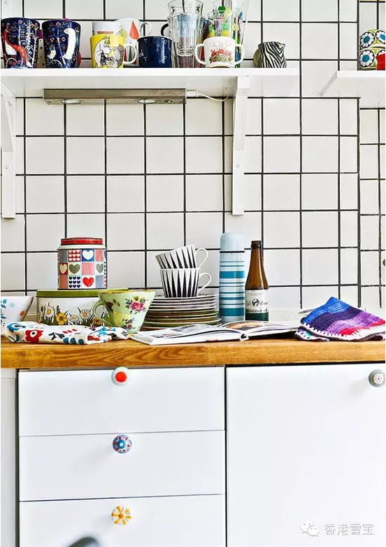 廚房,雖然顏色運用的很多,但完全不會覺得混亂,這是極其難得的一點,整個空間采光效果本身就不錯,加上選用的顏色以亮麗的色彩為主,更加顯得耀眼。