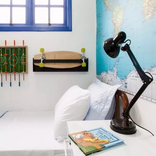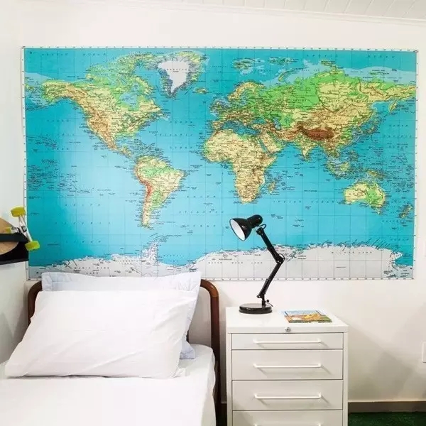 臺燈當床頭燈使用,移動方便,靈活性強,加上其小巧可愛的造型又為這簡約的空間帶來靈動美。地圖裝飾墻壁,美觀的同時還可體現主人興趣愛好。