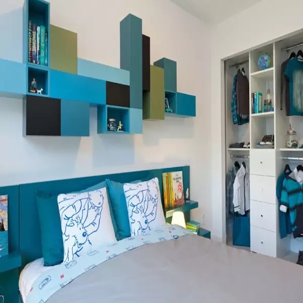 將大小不一的盒子隨意組合,美化墻壁的同時還提高空間的的立體美和層次美。陳列架和柜子相結合的衣櫥設計,則充分展現了衣櫥的空間利用率,凸顯空間強大的收納功能。