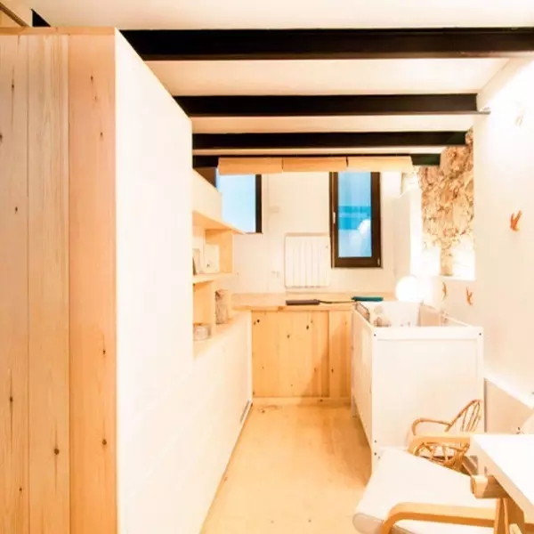 兒童床靠墻而放節省空間,柵欄式設計提高小床的安全性。而在走道上放置桌椅,則是不浪費任何空間位置的表現,木質的桌椅搭配綠色地板,相融相諧,盡添空間的自然風味。