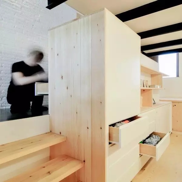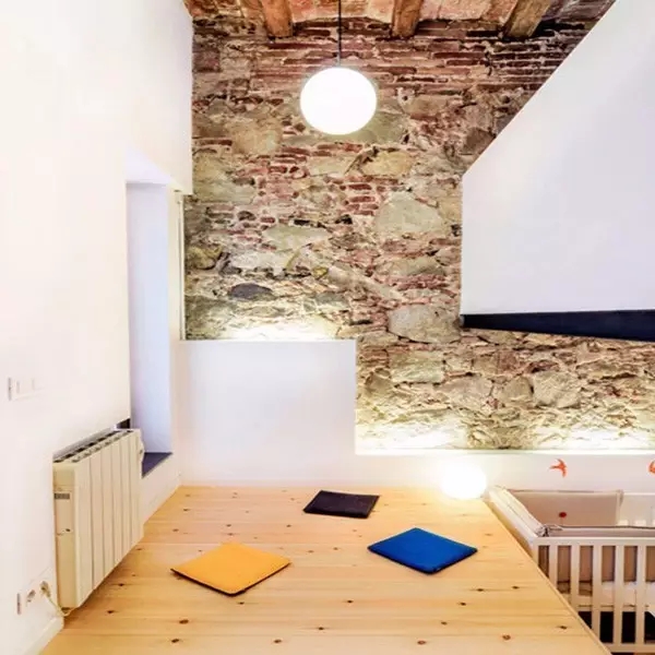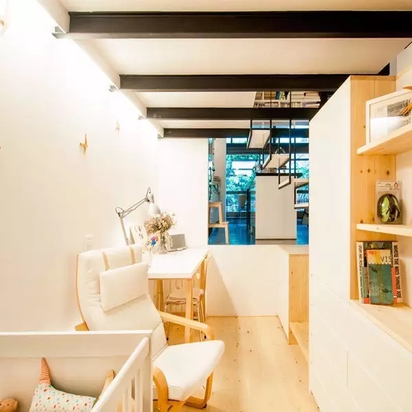背景墻保留了裝修前的模樣,古舊簡陋的墻壁為角落空間增添了工業風和復古風。儲物柜作為嬰兒房的收納空間,其頂部與地面層持平,成為了走廊空間。因為吊頂足夠高,所以走在上面也不會碰頭。