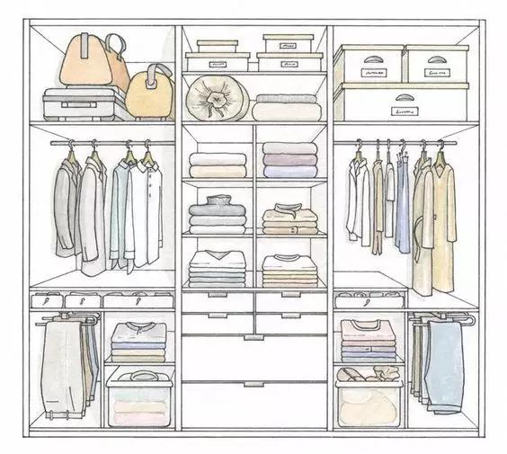 同時對目前的衣服數量與類別有清晰的了解,能夠確定衣柜的大小;對衣服進行分類,并為其安排合適的收納方式(平疊、豎疊、懸掛);根據衣服的比例分配掛桿、隔板、抽屜的位置與數量,并為后期的變動留出可以調整的空間。