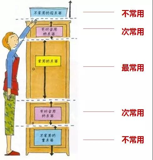 從上圖可以看出,應當在哪一區域放置不同類型的衣物。最上面和最下面放置被褥或不常用、過季的衣物,觸手可及的區域放置我們每天都會用到的衣物。